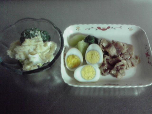 ゆで卵2種類(固ゆでと半熟)を利用したものです。